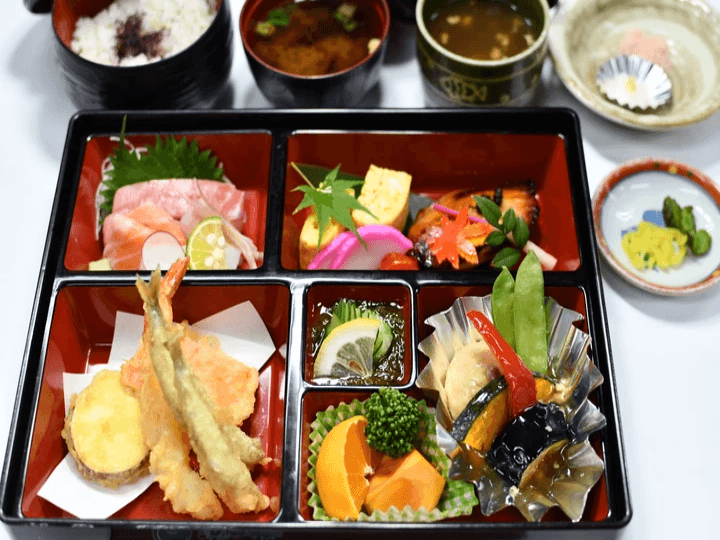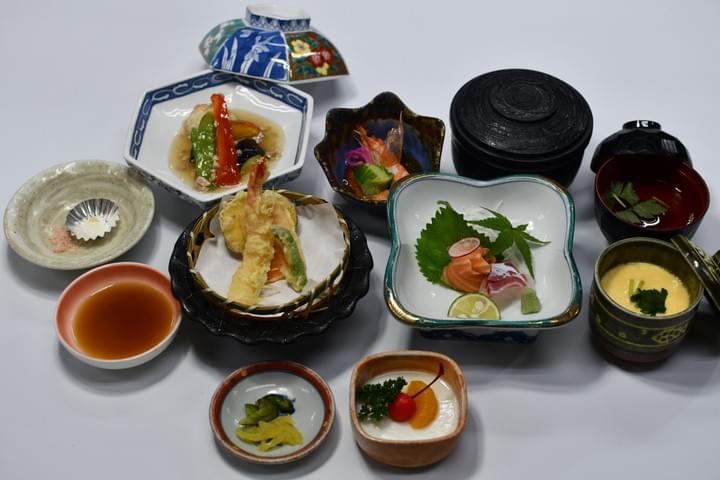 お造り4点、酢の物・焼き魚、和菓子、だし巻き、煮物、蒸し物(夏期:霊泉そうめん)、天婦羅+2品、フルーツ、漬物、伊賀米白飯、お味噌汁