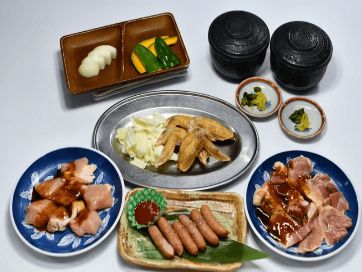 伊勢赤鶏100g、伊勢赤鶏ムネ100g、ウインナー3本、焼き野菜3点、お漬物、伊賀米白飯 手羽先(キャベツ付き)