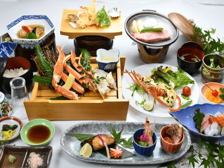 A5松阪牛陶板焼き、お造り、カニ足、前菜(焼き魚、酢の物、小鉢)、蓋物、蒸し物(夏期:霊泉そうめん)、1人盛鍋(トマト鍋)、天婦羅、デザート、漬物、伊賀米白飯、お吸い物